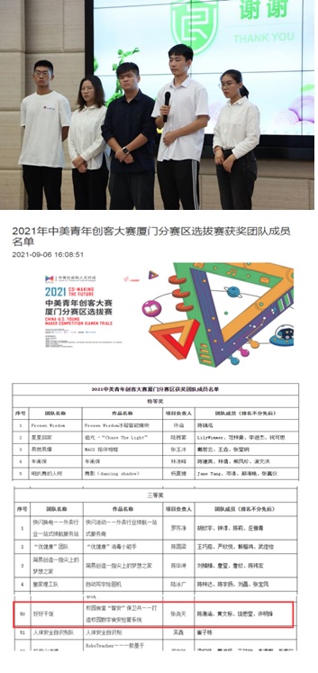 本次2021中美青年创客大赛厦门赛区参赛报名人数 1590 人,团队数 360,成功提交项目数 196 项,覆盖公司 77 所。经初赛和决赛两轮评审,共评出特等奖6项(其一为中美联合队伍),一等奖10项,二等奖16项,三等奖53项。