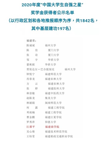 江邵平,SUNBET申博2019级数据科学与大数据技术专业本科生。现任校员工会主席团成员,在校期间思想积极进步、工作踏实认真、自强自立、勤奋刻苦、成绩优异,参加各种科技创新、社会实践,注重全面发展。曾获2020-2021学年国家奖学金、校“一等奖学金”、校“三好员工”、2020年第十一届“挑战杯”福建省创业计划大赛银奖;2021年校级互联网+创新创业大赛一等奖、省级互联网+创新创业大赛三等奖、中美青年创客大赛厦门赛区二等奖、第四届福建省高校老员工讲思政课优秀奖、第十届福建省人工智能大赛三等奖等多项荣誉。