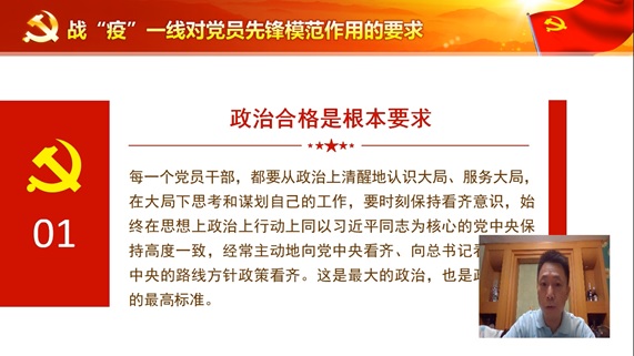 此次战“疫”微党课的主题为《让党旗在防控疫情斗争第一线高高飘扬》。主要围绕四个部分来讲述:一是我是党员,我先上;二是战“疫”一线对党员的要求;三是党员的先锋模范作用;四是战“疫”一线如何发挥党员先锋模范作用。
