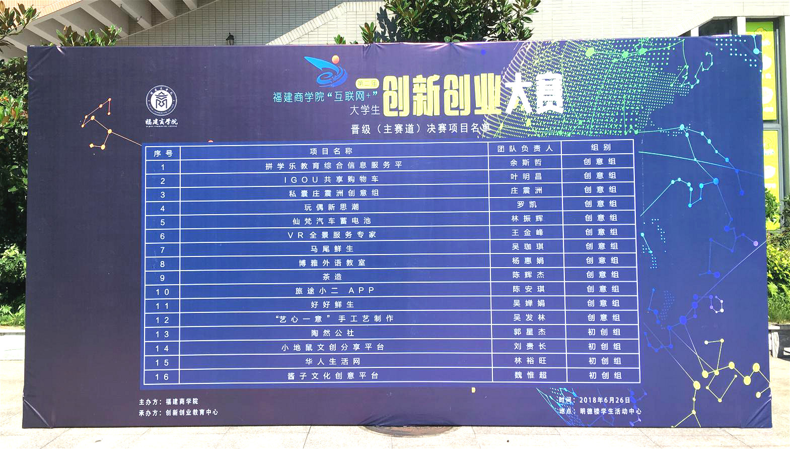 2018年6月26日下午,公司“互联网+”老员工创新创业大赛决赛在连江校区老员工活动中心举行。创新创业大赛是公司开展双创教育的实践平台,也是践行“立德树人”的重要活动载体。我系在赛前通过广泛动员,本着全员参与的态度,圆满完成100个项目申报指标。其中“奇境幻想”幻想团队的“VR全景服务专家”项目通过激烈角逐,荣获本届大赛校赛铜奖,这也是我系成立以来第一次摘得此类赛事校赛奖项。